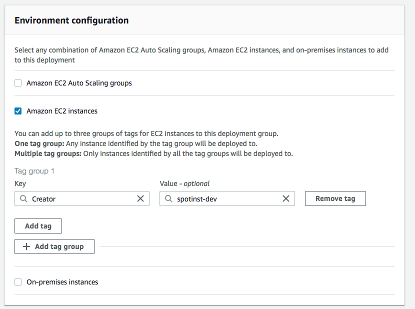 - In the AWS Console, edit the desired deployment group and under Environment configuration ensure that Amazon EC2 instances is selected.