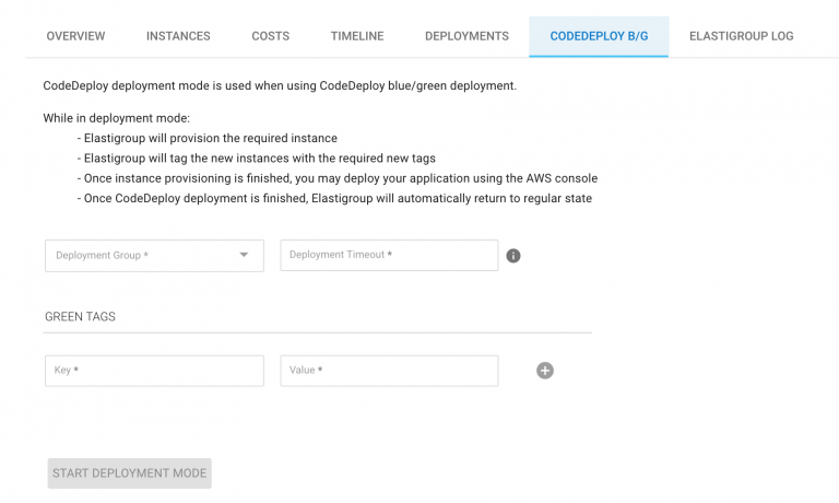 Elastigroups with Code deploy integration offers an option to utilize the B/G deployment mechanism. The Elastigroup will provision new instances in the Elastigroup with 'green' tags (user configurable) after the Tags are added to the instances, the user may start the deployment from AWS Code Deploy console. Once completed, Elastigroup will detach the old, 'blue' instances.