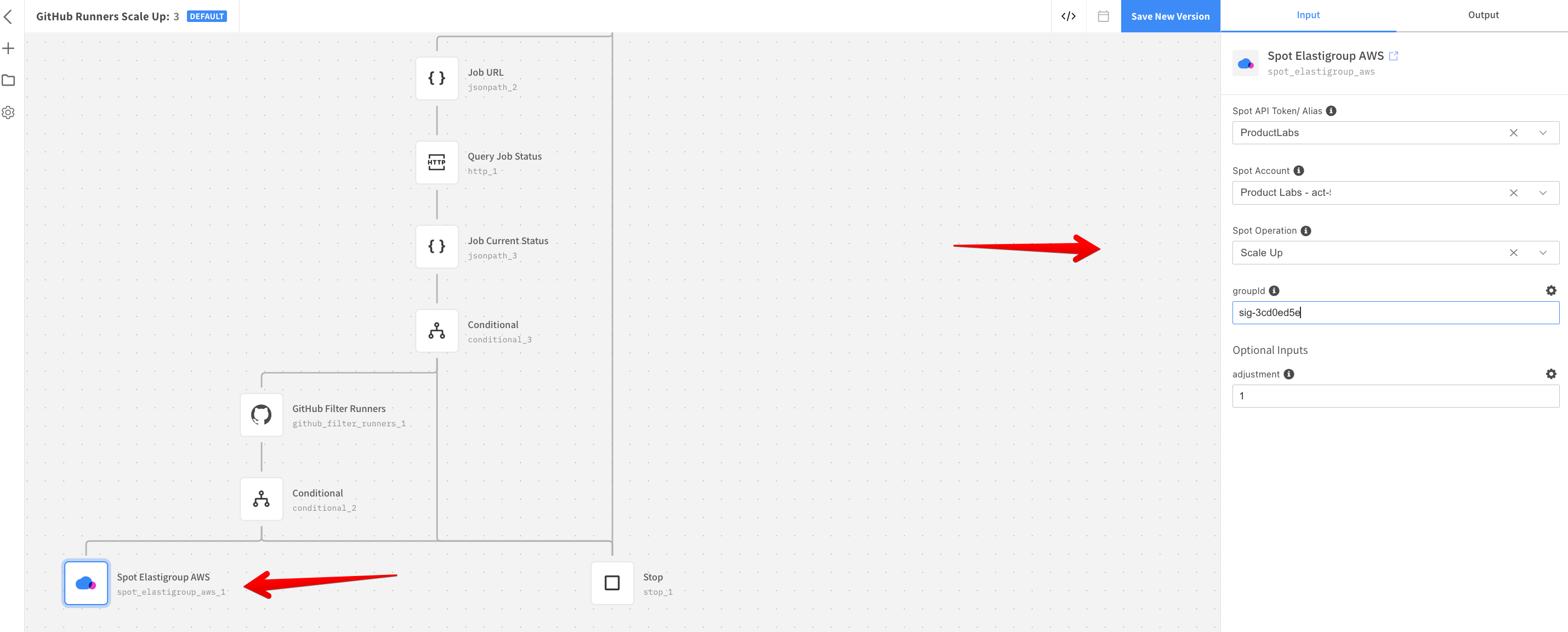 self-hostedlabel. The GitHub resource ensures that the scale-up is triggered only if there are no idle instances alive that match the labels required by Workflow Jobs. This results in avoiding any unnecessary scale-ups. - Configure the Spot Elastigroup AWS resource by selecting Spot Instance configured in Step 1. Select the Spot Account and Elastigroup ID you created in Step 4. The Spot Operation must be kept as Scale Up in the Spot Operation field with an adjustment of one instance at a time.