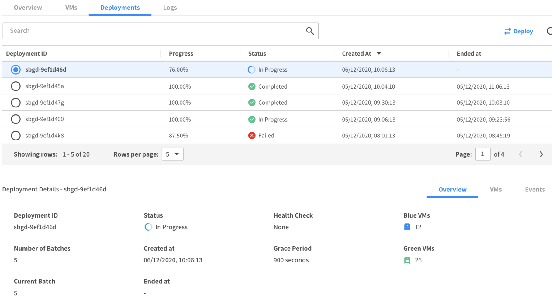 When at least one deployment is in progress, the Deployments tab refreshes information automatically every 30 seconds.