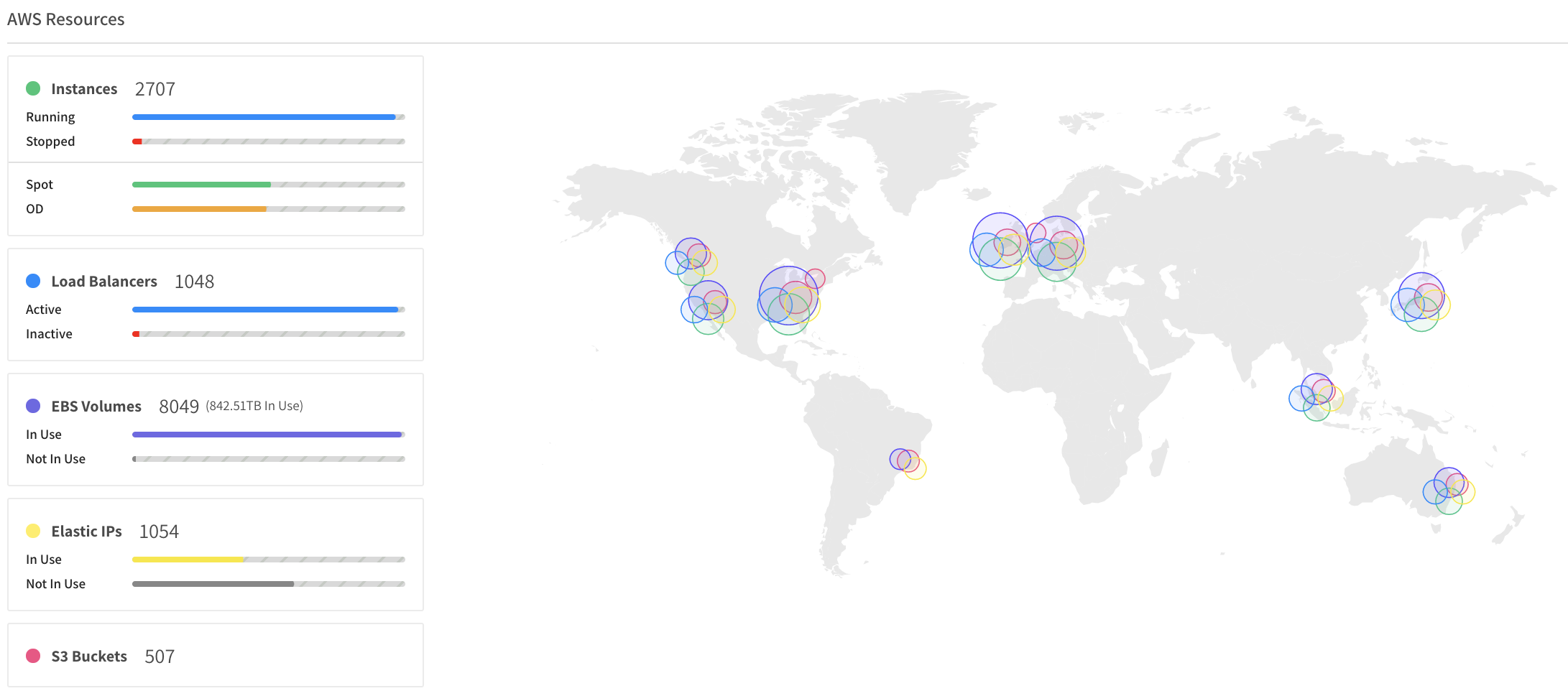 The map displays the AWS regions in which the resources are managed. The colors in the map correspond to the colors indicated for each resource on the left. You can also see the utilization data by hovering your mouse over the circles in the map.