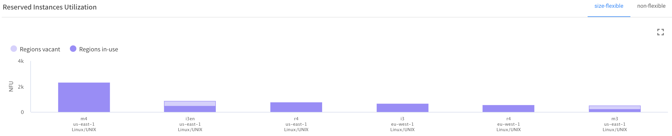 - Flexible RIs: This graph provides insight into your NFU utilization per region. (NFUs are normalized factor units, available CPUs based on the AWS instance size flexibility model.