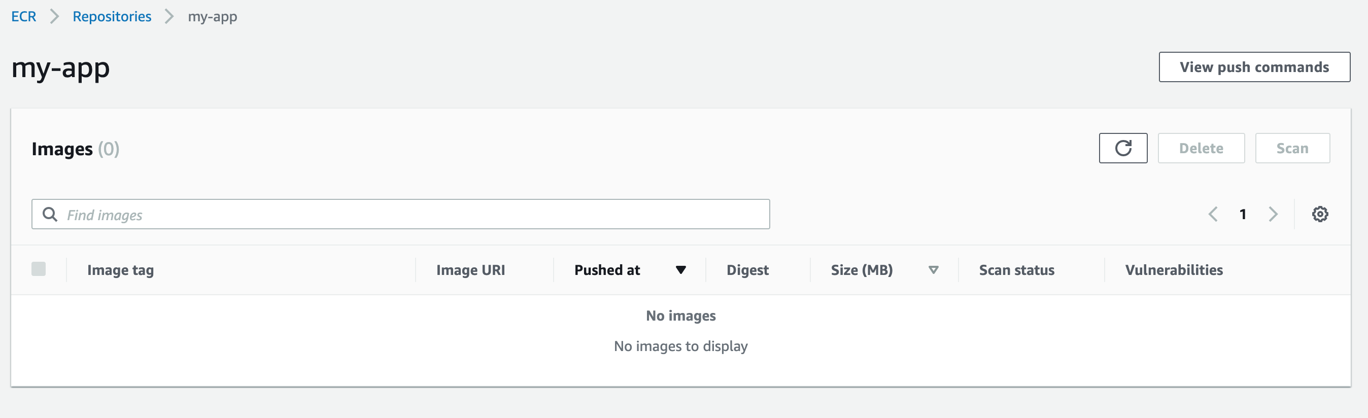 docker push <account-id>.dkr.ecr.<region>.amazonaws.com/my-app:devRefer to the AWS documentation about ECR in case of issue.