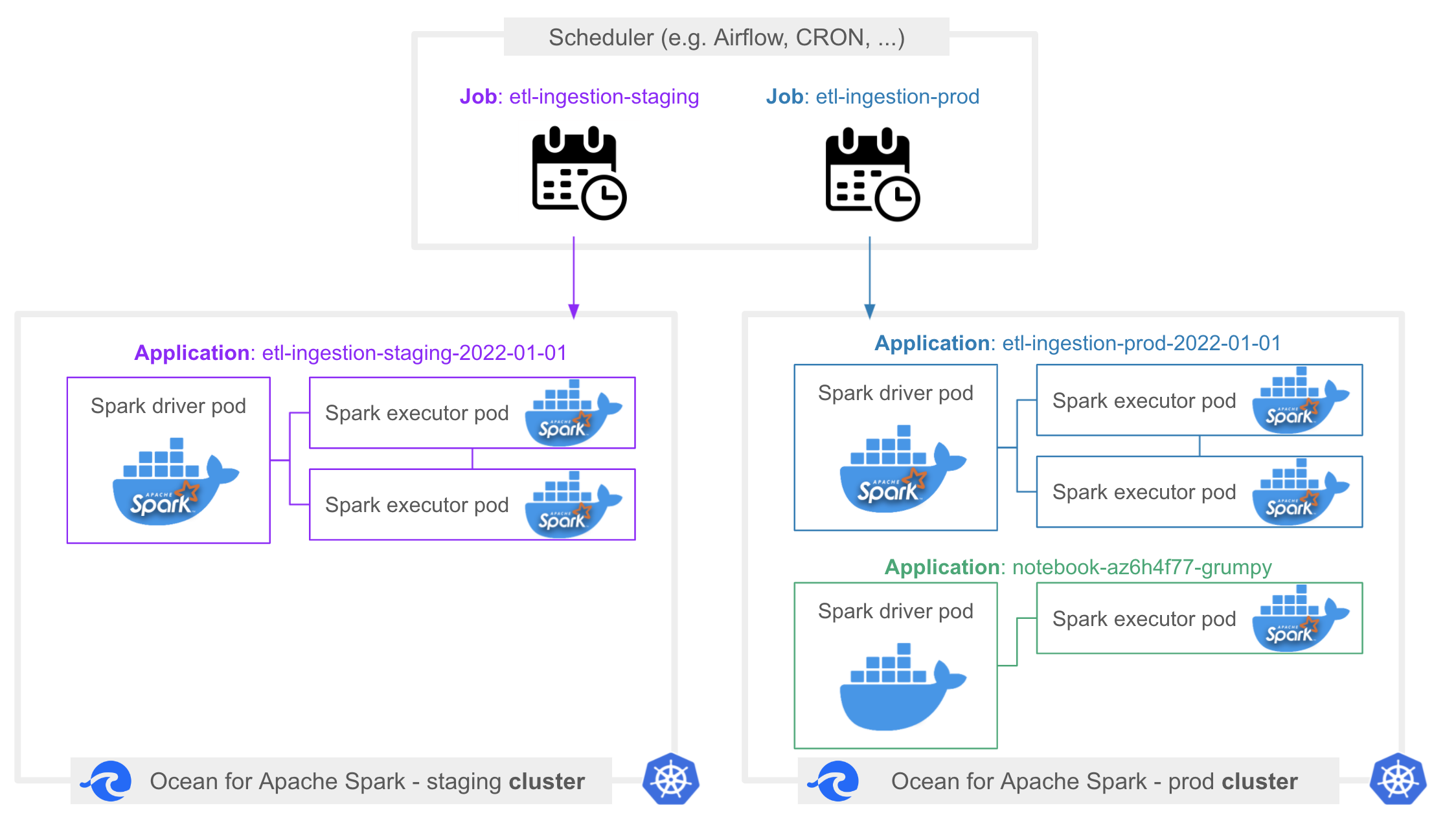For example, you could define a job with the ID daily-etl-ingestion. This job would be scheduled on a daily basis from Airflow, and then applications within this job could be daily-etl-ingestion-2022-01-01, daily-etl-ingestion-2022-01-02, daily-etl-ingestion-2022-01-03, etc.