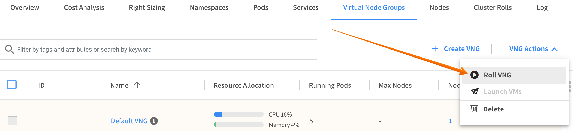 2. Select checkboxes for the virtual node groups to roll from the list.
